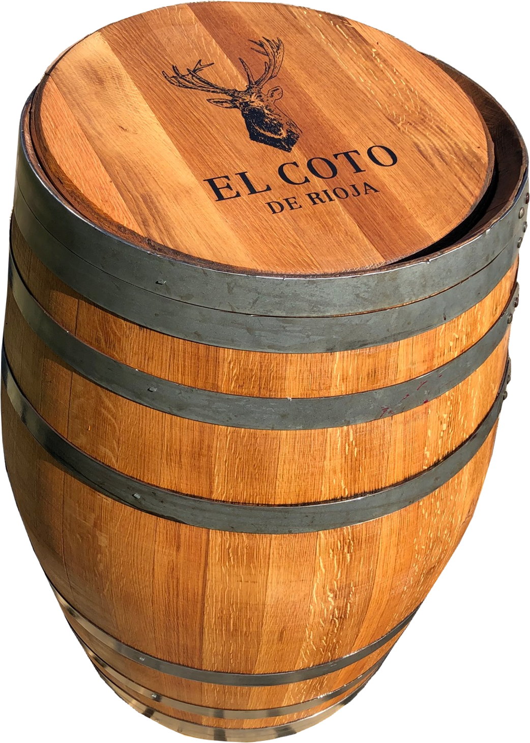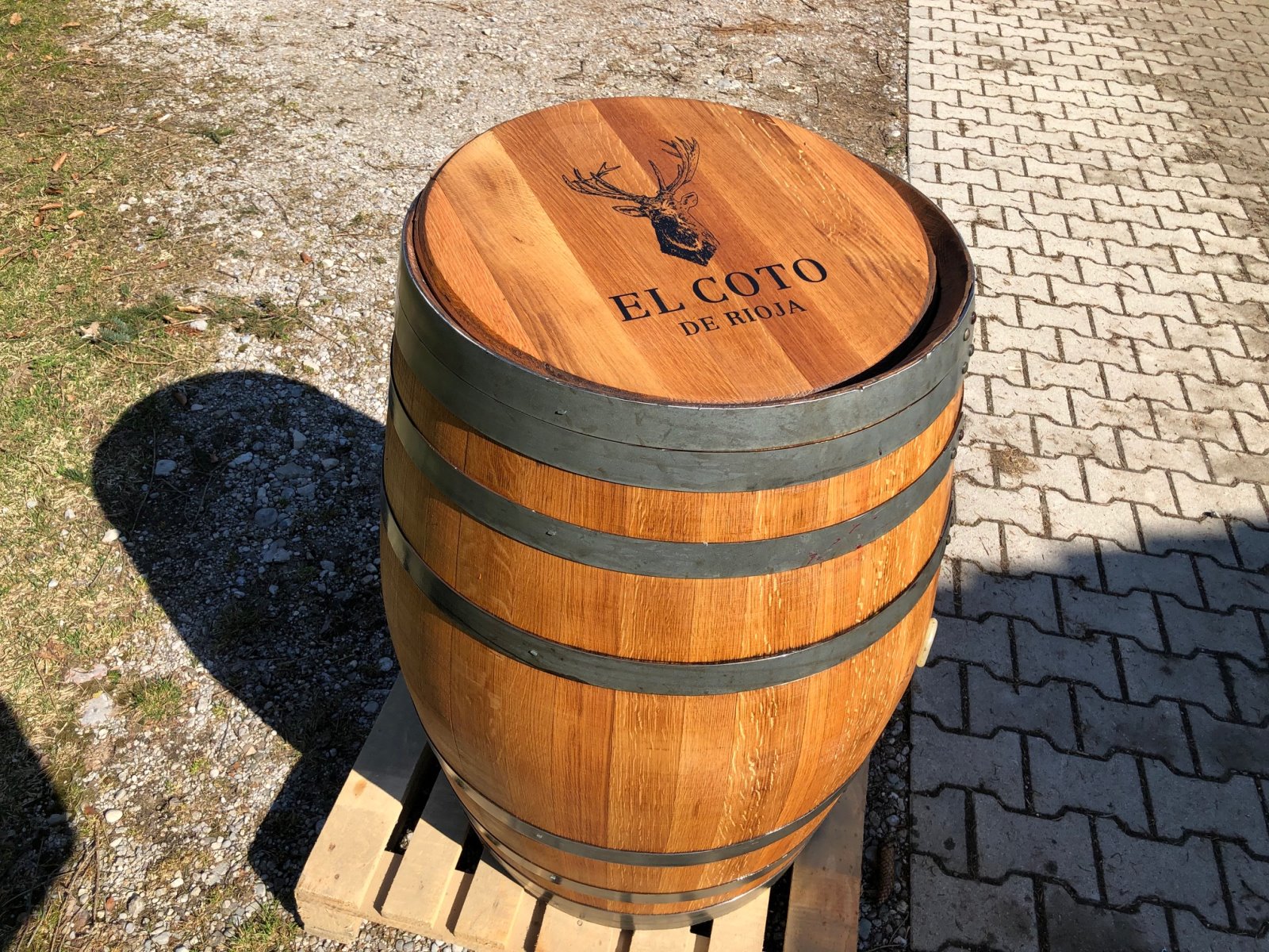 Weinfass Fasstisch - Tischfass abgeschliffen und geölt mit Logobrand " el coto "
