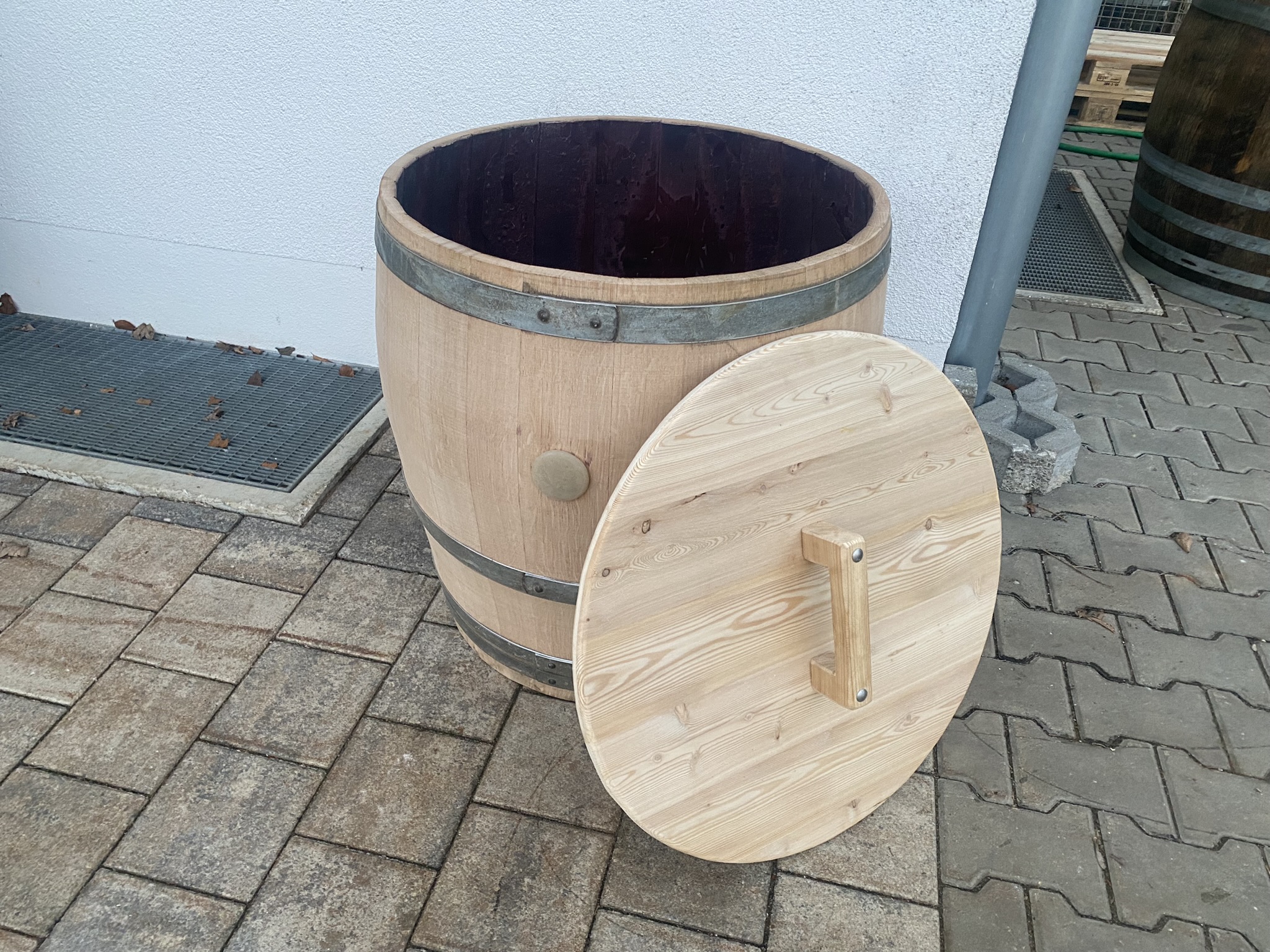 - Der obere Abschnitt des Fasses, bestens geeignet als Vogeltränke oder Kräuter Fass